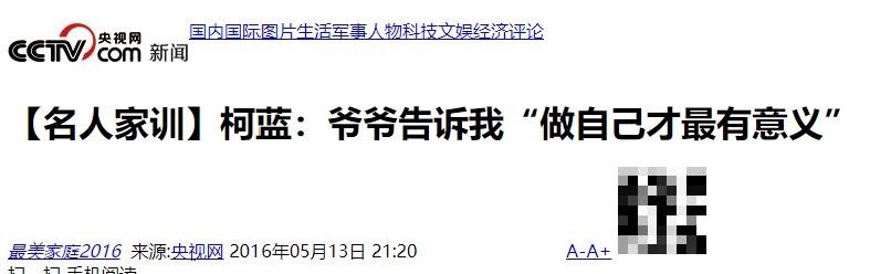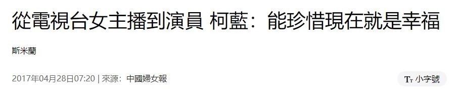参考文献:1.央视网:《【名人家训】柯蓝:爷爷告诉我“做自己才最有意义”》2016-05-132.中国妇女报:《從電視台女主播到演員柯藍:能珍惜現在就是幸福》2017-04-28