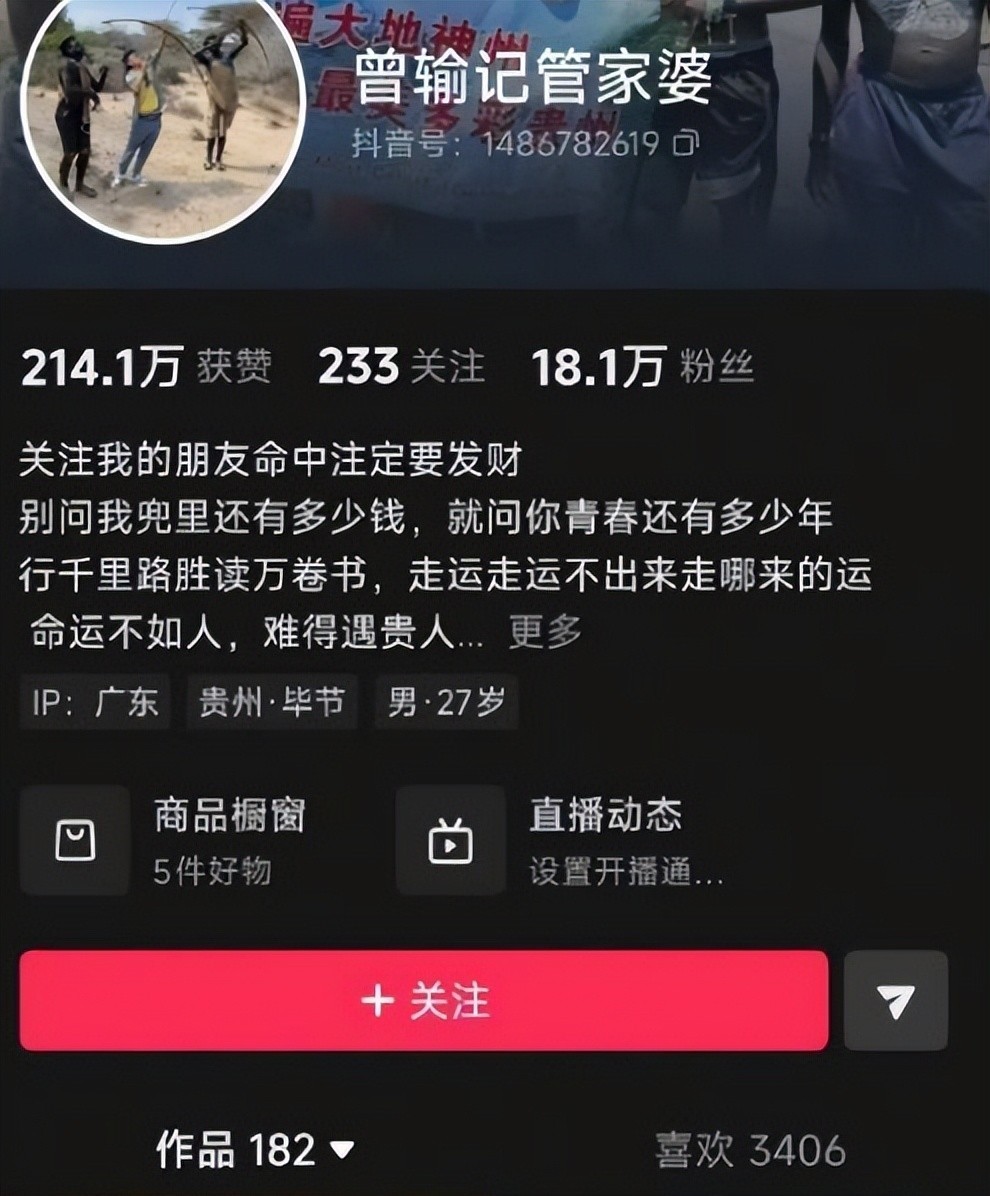 该博主名为“曾输记管家婆”,以一句“走遍大地神州,最美贵州”为口号远赴非洲,致力于向当地人传播贵州话和本土文化,这种极具反差感的内容迅速积累大量粉丝。