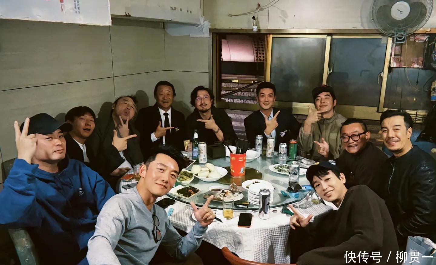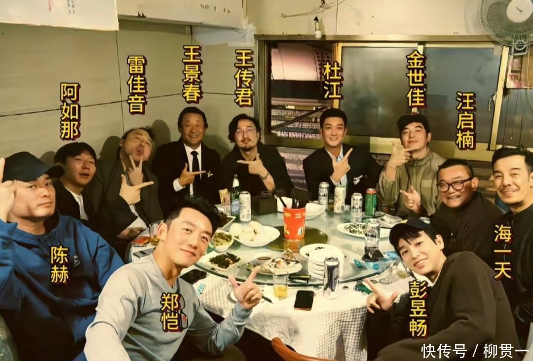 然后就是男演员这桌,雷佳音、陈赫、郑恺、王传君、阿如那、杜江,活动一散场,拐弯进了家苍蝇馆,门脸小,烟火味重,结果呢,被网友打趣一句老登局,笑归笑,这不就是同学聚会那味儿吗?