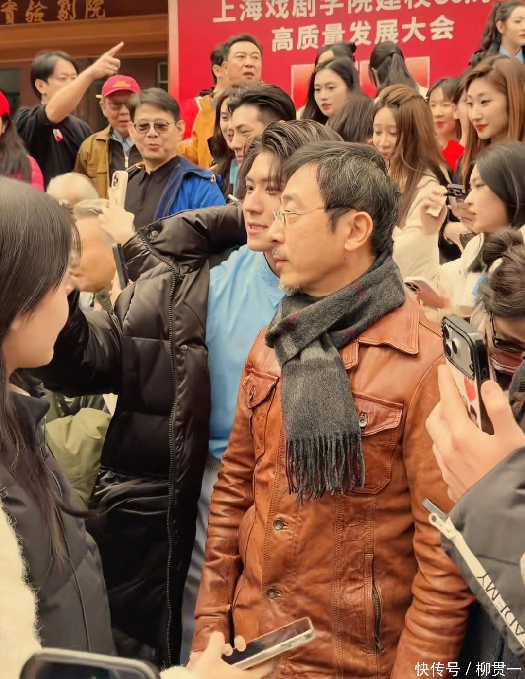 果靖霖出现,白发一头,黑夹克利落,走到哪都有师弟师妹要合影,55岁这状态,确实稳,你说是不是那种不费劲的帅?