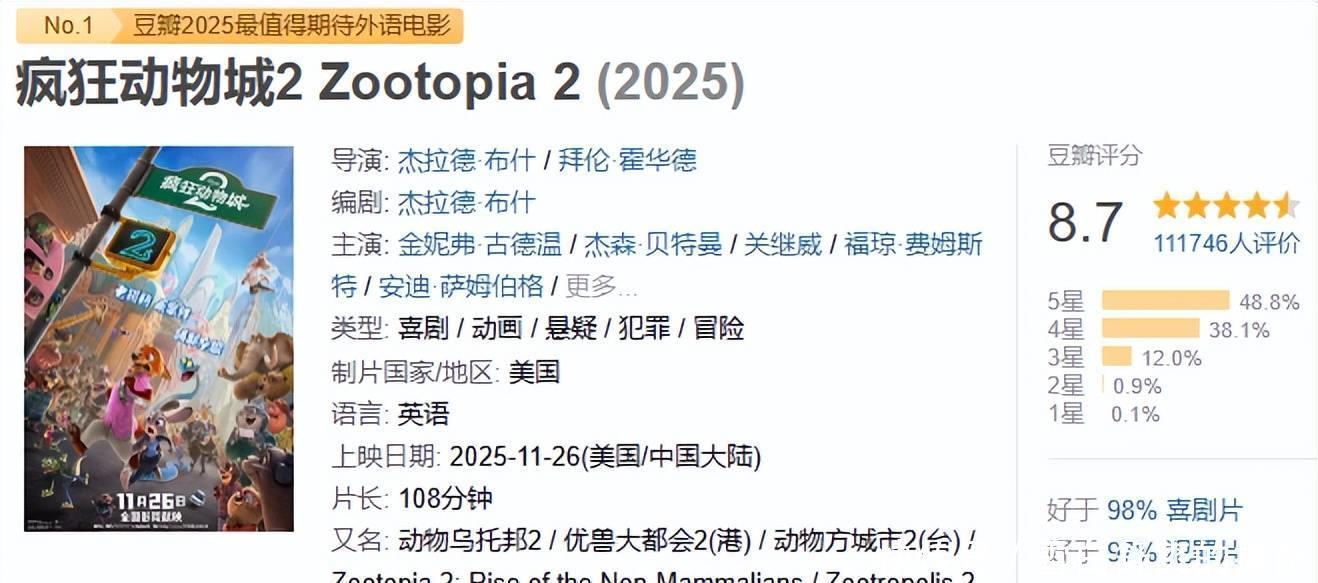 毕竟9年前,200多万人打出的9.3分,至今还有迹可查。而《疯狂动物城2》一开分就是8.7,成为最值得期待外语电影榜一。