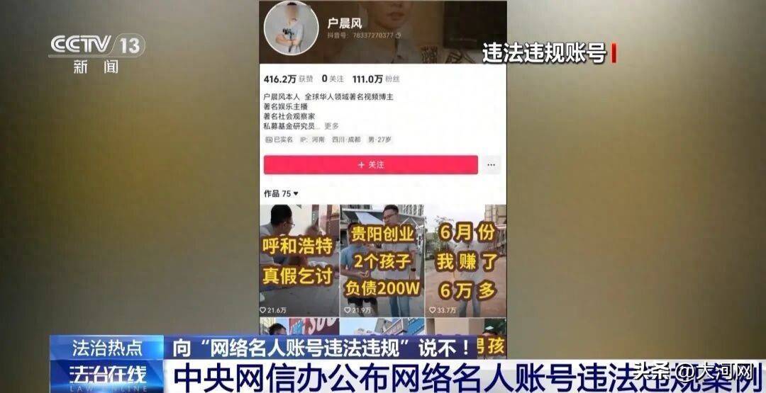 互联网时代的多元表达不代表能够无底线博流量,除了户晨风这种制造尖锐对立议题、煽动群体间情绪、贩卖焦虑,来吸引眼球和流量的这类乱象外,在此次中央网信办的通报中所列违规账号还存在多种违背公序良俗的恶劣行为。