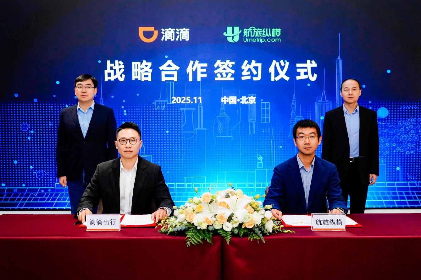 11月25日,滴滴与中航信移动科技股份有限公司(以下简称“航旅纵横”)达成战略合作。本次合作是以“交通强国”与“构建综合交通运输体系”战略为指引,打破航空与地面交通服务壁垒、打造“一体化大交通生态”的关键实践。滴滴董事长兼首席执行官程维、航旅纵横董事长兼总经理薄满辉共同见证合作签约。滴滴网约车首席执行官孙枢和航旅纵横副总裁兼产品中心总经理刘丰代表双方签约。滴滴首席技术官赖春波、安全与政府事务高级副总裁庞基敏、副总裁徐鹏、网约车平台乘客部总经理杨硕,航旅纵横主要负责同志一同参加会谈。
