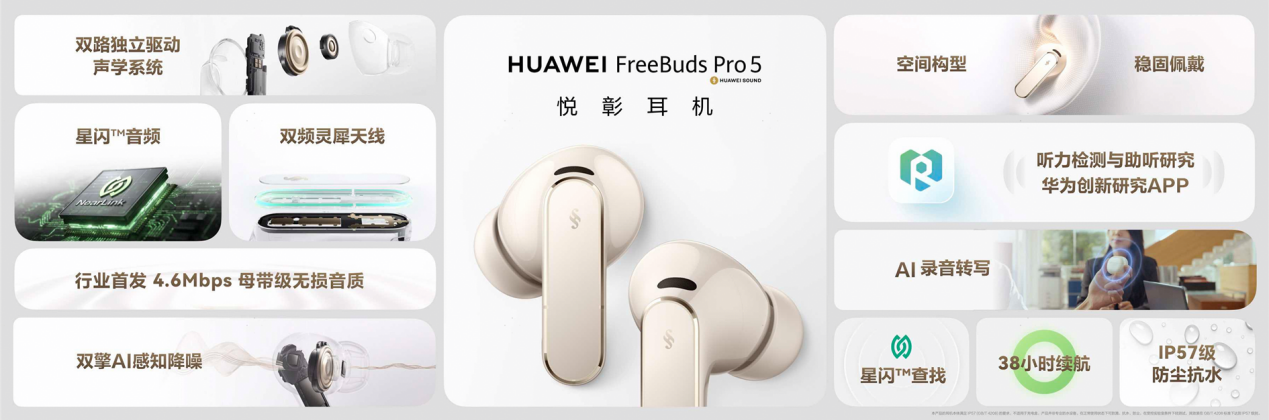 音频与智能家居方面,华为FreeBuds Pro 5悦彰耳机为业界首款支持星闪音频技术的无线耳机,传输速率达4.6Mbps(96kHz/24bit母带级无损),采用双单元双路主动降噪(降噪提升220%),支持听力检测与助听研究(需配合华为创新研究APP及HarmonyOS 6以上设备),售价1499元,12月31日前购机赠HUAWEI Care+。华为首款艺术路由X3 Pro日照金山以“日照金山”为设计灵感,搭载透明天线(微米级蚀刻电路)、第三代PLC千兆组网及星闪连接,起售价1299元,11月25日10:08开售。