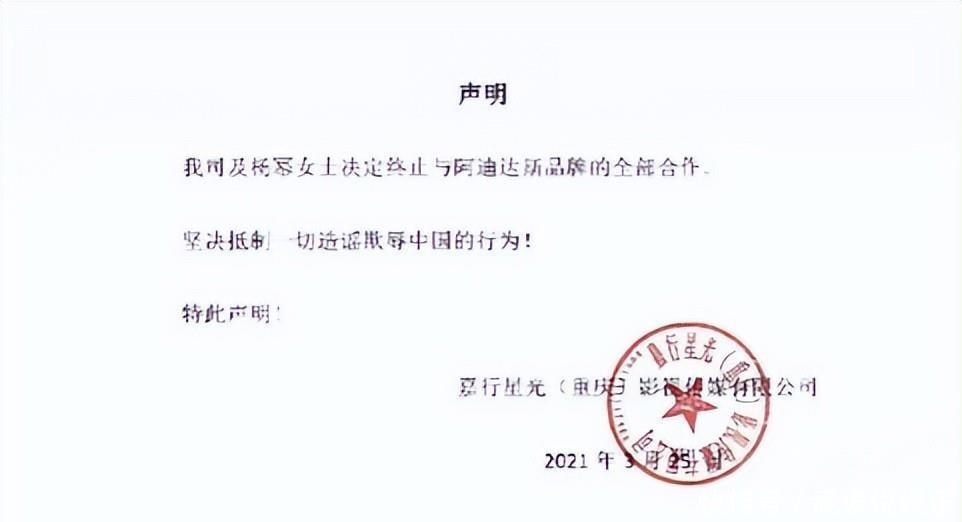 到了2021年,关于阿迪新疆棉的事儿刚传开,杨幂就立马跟这个牌子划清了界,自觉解除了合作关系。