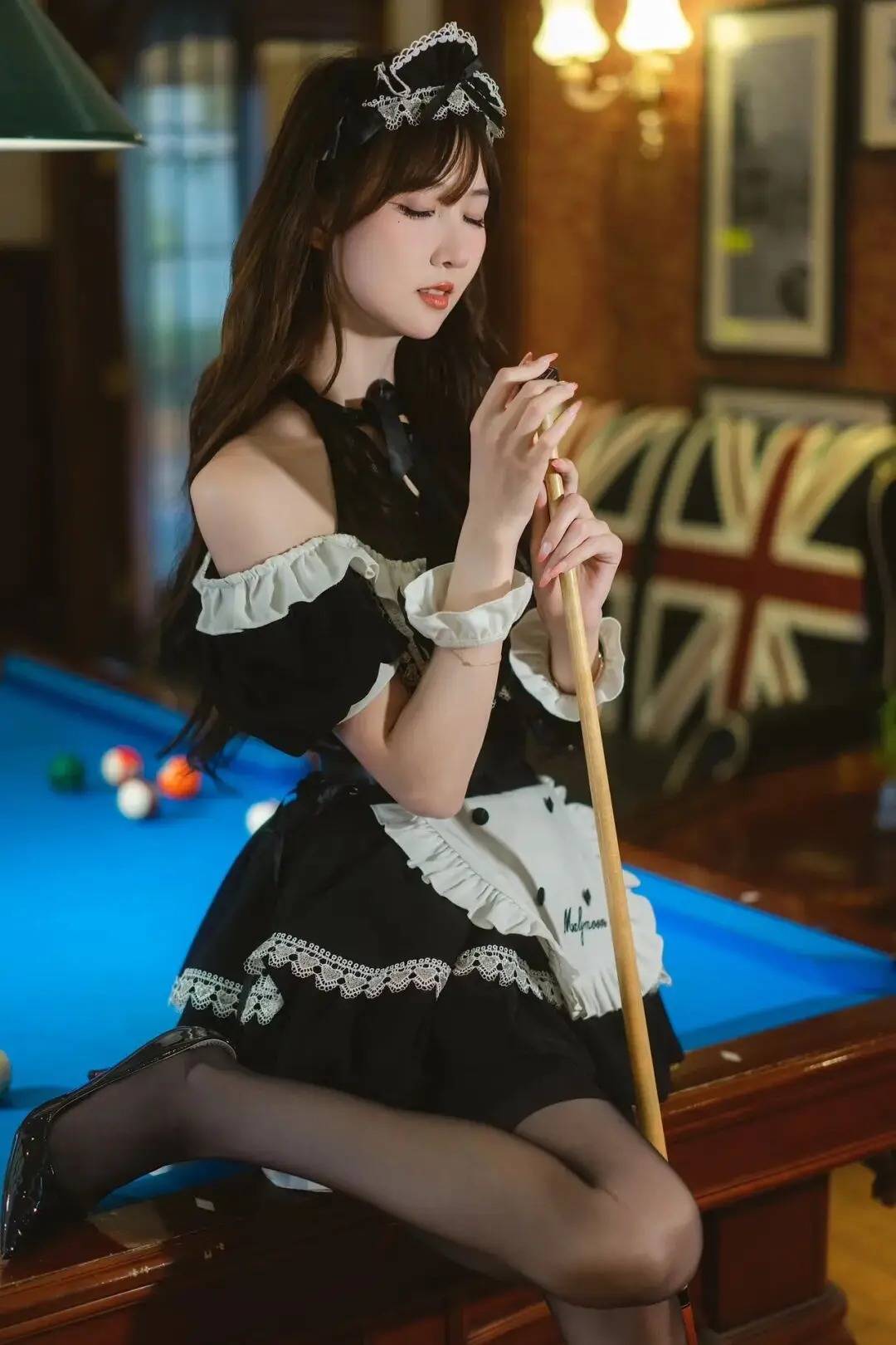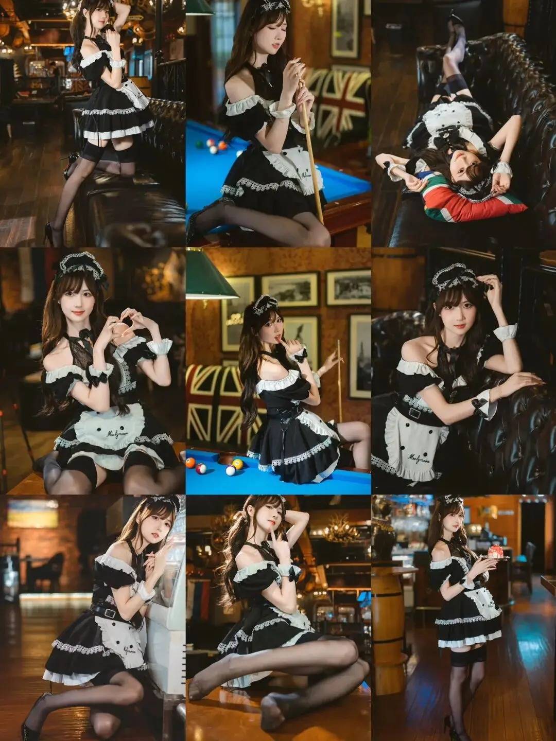 人物手持台球杆,姿态娇俏又带点飒气。这种姿势巧妙利用道具融入场景,结合坐姿的线条感,在复古风台球室里轻松营造出甜酷氛围。搭配精致穿搭和灵动神态,仿佛把复古格调与少女娇俏感完美融合,谁拍谁是镜头里的风格担当,出片绝绝子!