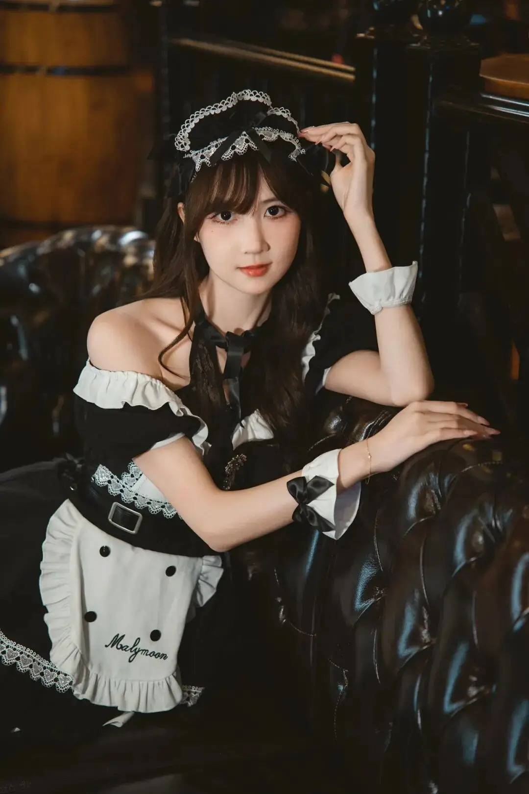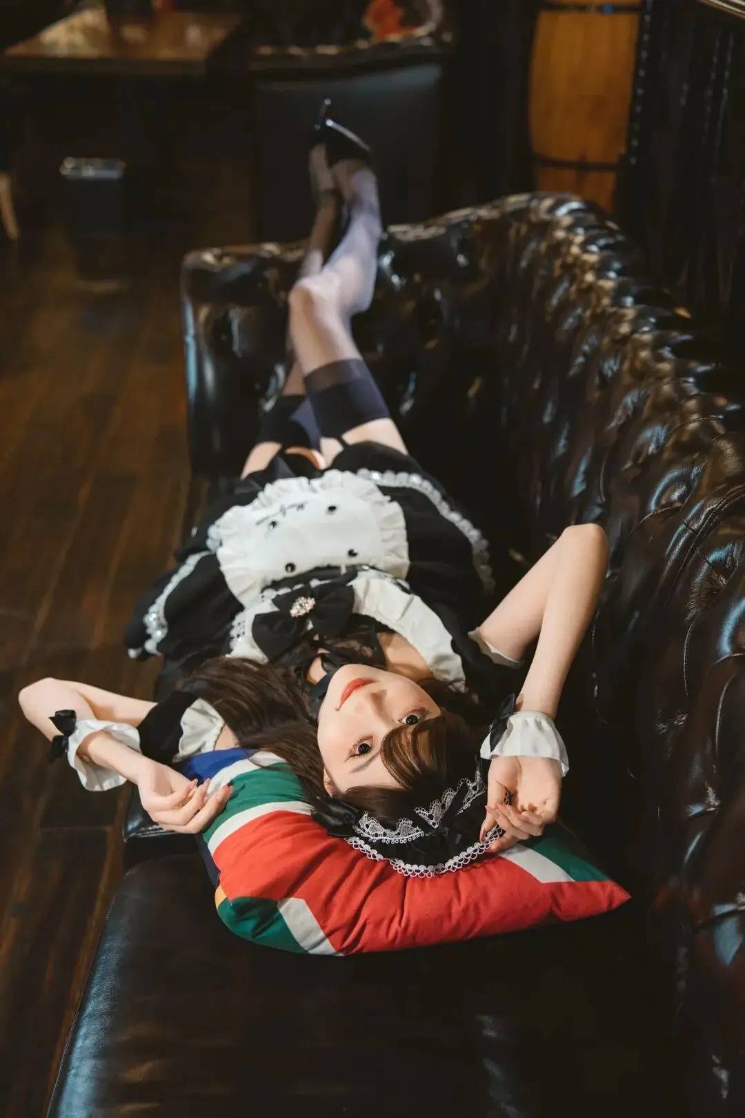 人物在皮质沙发上摆出轻熟又带点娇俏的姿势,一手搭头、一手轻握道具,肢体线条错落有致。这种姿势巧妙利用环境道具增加互动感,结合侧身姿态凸显曲线,在复古风场景里轻松营造出魅惑又不失甜美的氛围,就像把复古画报的质感直接搬进现实,谁拍谁是镜头焦点,出片绝绝子!