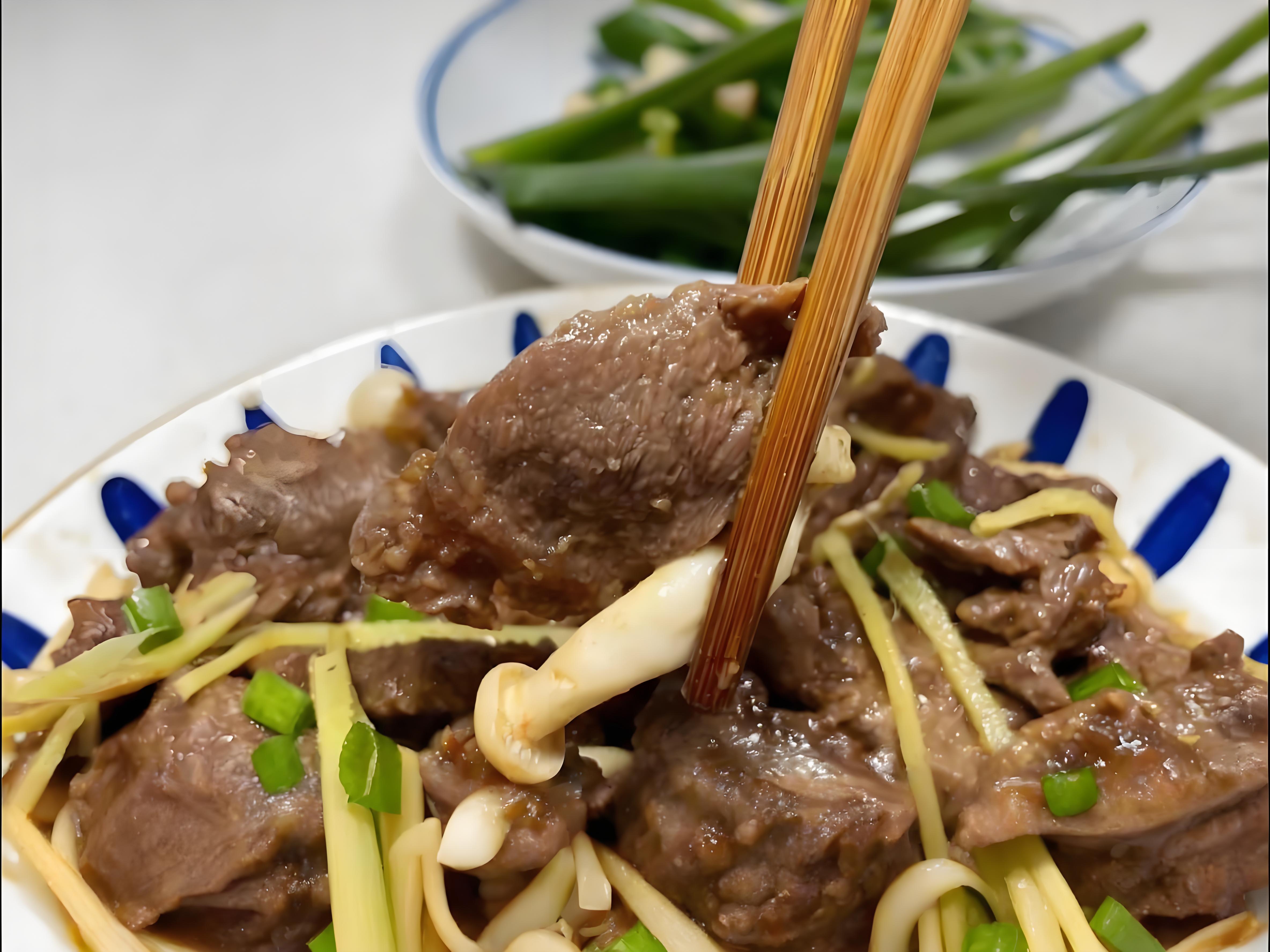 这个菜,用的是“蒸”的做法,特别健康少油烟。姜丝能驱寒暖胃,和牛肉是绝配。蒸出来的牛肉片又滑又嫩,牙口不好的也完全没问题。