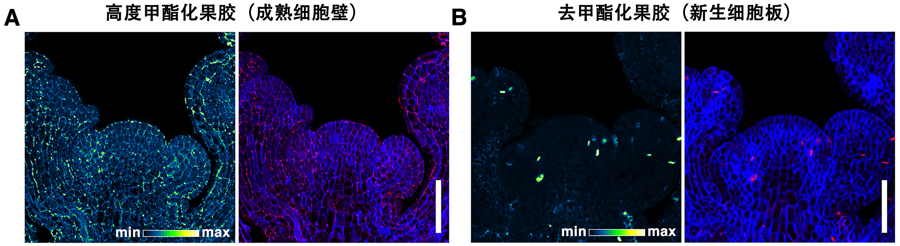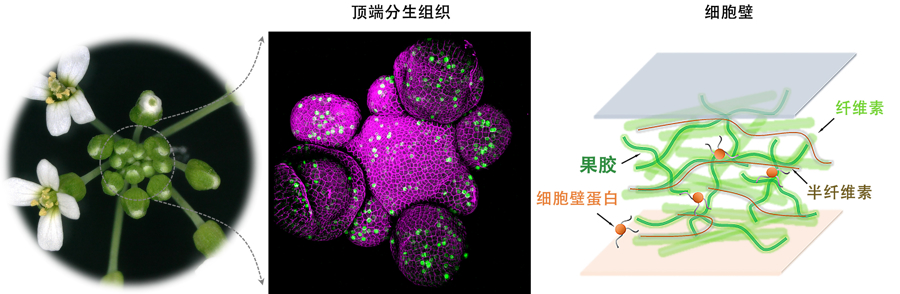 论文通讯作者杨卫兵研究员介绍,细胞壁作为植物细胞的“外骨骼”,其力学特性在干细胞调控中扮演着核心角色。研究发现,在植物茎尖干细胞区域,细胞壁的主要成分果胶呈现出独特的“二元分布”模式:新形成的细胞横壁偏“软”,富含去甲酯化果胶;而成熟的细胞壁则更“硬”,以高度甲酯化的果胶为主。这种“软硬兼备”的时空构型,对维持干细胞微环境稳态至关重要。