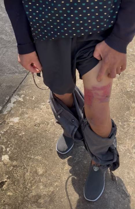 陈平在展示自己做工时腿上受的伤。 杨书源 摄